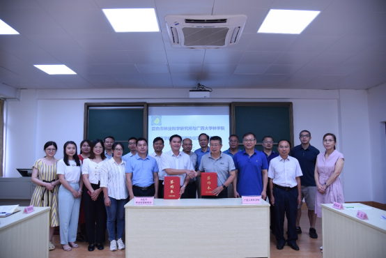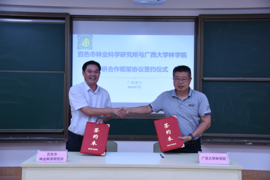 百色市林业科学研究所副所长黄日正、英国365集团杨梅副院长及到会人员就双方的合作领域、合作形式及保障措施等方面进行深入探讨与交流。随后,双方签订了产学研合作框架协议,将在科学研究、技术创新、成果转化和人才培养等领域开展全面合作。