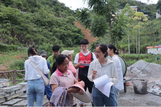 7月17日至7月20日,实践团师生先后走进了达腊村、口角村、者仲村和百林村,首先听我校驻村第一书记和村干们介绍了村里的基本经济情况、人口情况、乡村建设及发展现状等。接着,实践团师生走村入户,通过问卷调查、实地调查及访谈当地居民的形式,积极进行乡村振兴战略政策的宣讲,向村民普及建设美丽乡村的重要意义,同时了解到村民生活现状以及其对当地产业发展、乡村建设的迫切需求和真切期待。最后在驻村第一书记和村干们的带领下,实践团师生先后来到了达腊村那坡彝族生态博物馆、“跳弓节”民俗文化活动中心、田万水库,口角村顶胜山、桑蚕扶贫产业示范点,者仲村养牛专业合作社、便民榨油坊以及百林村达金谷等地进行了细致全面的现状调查和产业调研,并在专业人员的指导下,主动协助当地居民剥蚕茧、摘桑叶。调研过程中,实践团迎着烈日、挥洒汗水,走村入屯深刻分析和了解以顶胜山为中心的四个村的乡村建设与产业发展现状,与村干、村民一起认真思考、深究发展产业的瓶颈和关键,力求结合实际生活生产和学科专业知识,为那坡县达腊村、口角村、者仲村和百林村的全面发展谋思路、提点子。