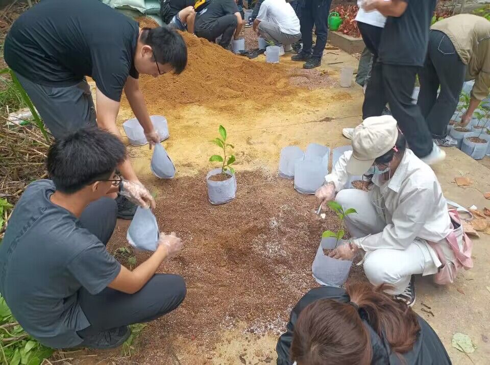 现场,班主任徐圆圆老师带领同学们参观教学实习基地苗圃,向同学们详细讲解了苗圃的组成以及容器苗培育的关键技术。紧接着,我院2023级生态学博士研究生马道承向同学们介绍苗木种类、育苗容器和基质选择,并亲身示范育苗基质的配制及观光木容器苗的换盆移栽过程。同学们听得饶有兴致,以小组为单位,争先恐后的参与到“容器苗培育—观光木苗木换盆移栽”劳动实践活动中。