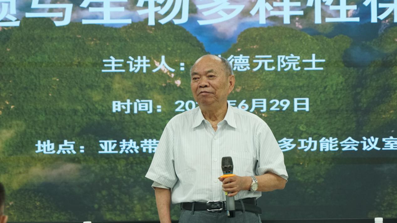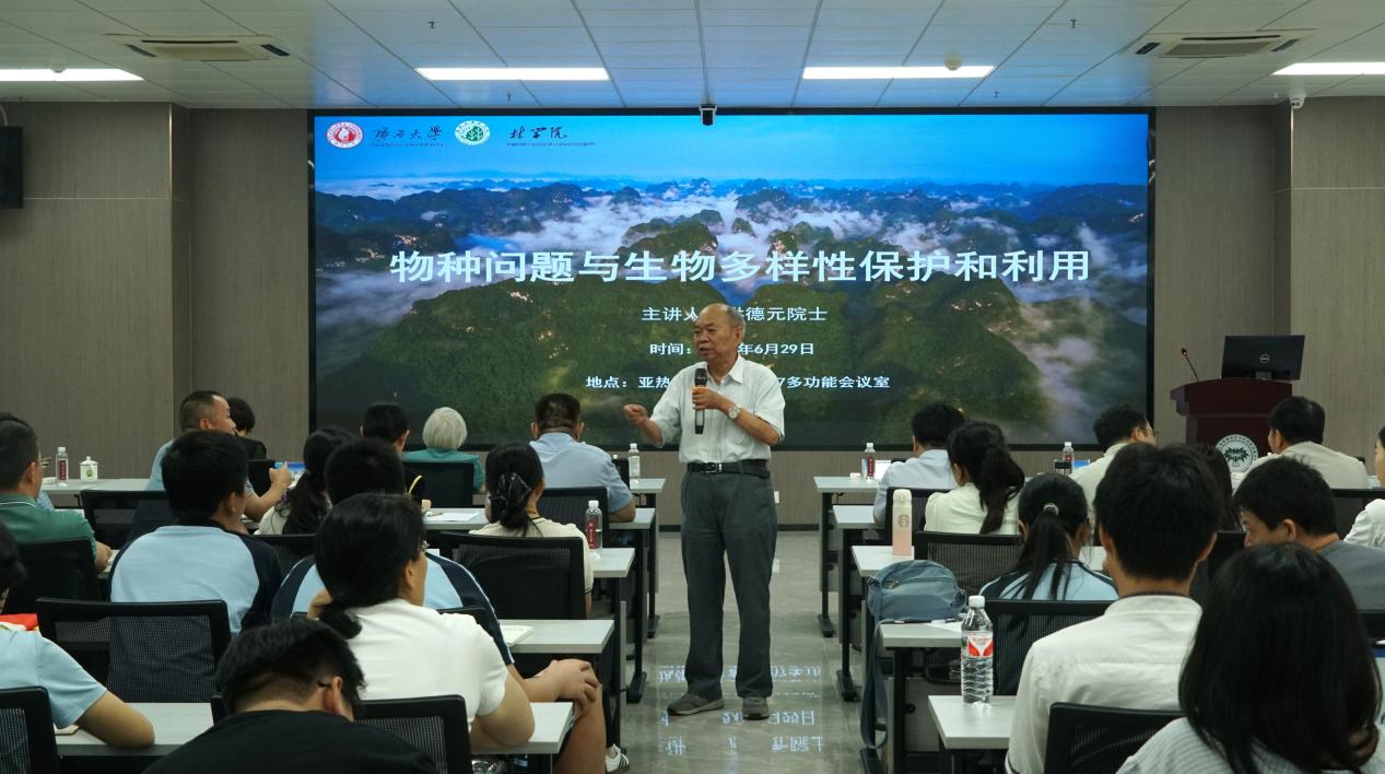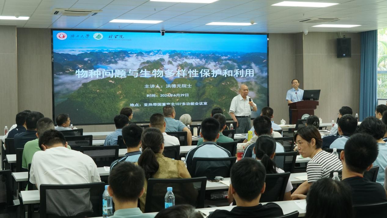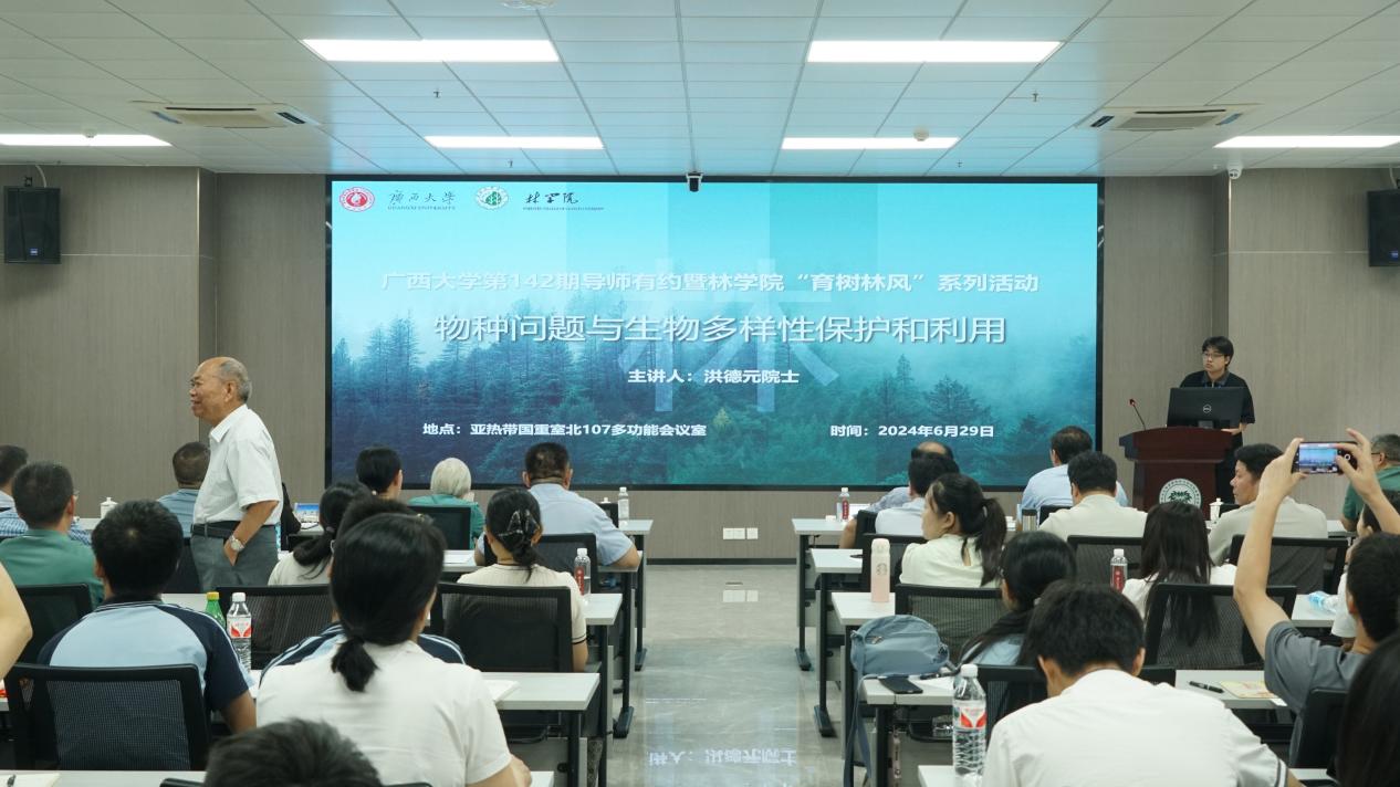 6月29日上午,我院成功举办第142期导师有约暨“育树林风”系列活动,中国科学院院士、第三世界科学院院士、世界著名的植物学家洪德元应邀以《物种问题与生物多样性保护和利用》为题,在亚热带重点实验室107会议室为我校师生作学术报告。学校副校长于文进主持报告会,自治区林业局局长蔡中平和二级巡视员蒋迎红出席报告会,英国上市公司365师生、自治区林业局、驻邕的研究机构及南宁市重点中学等单位代表共计160余人参加报告会。