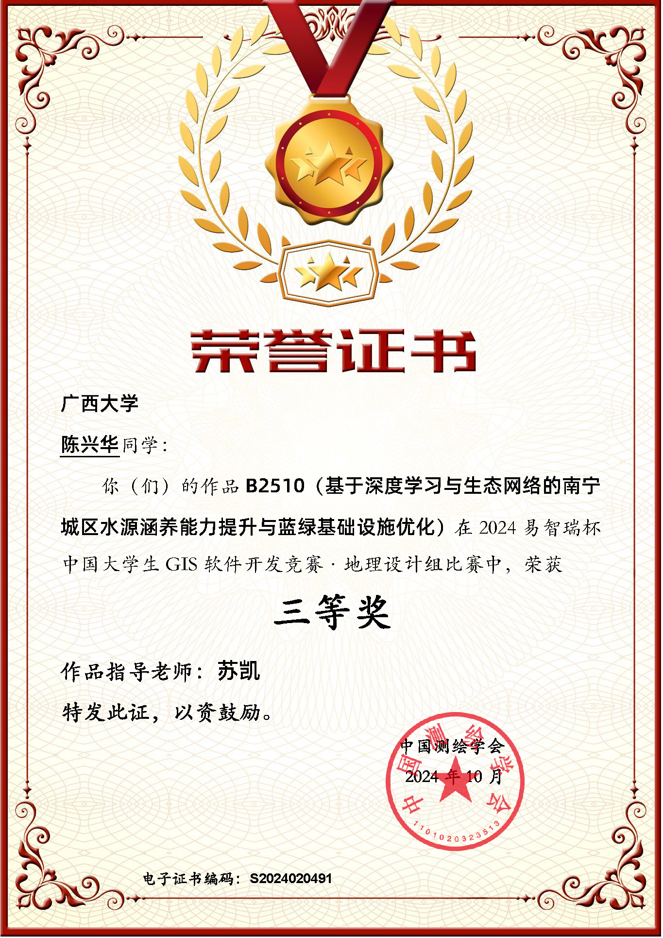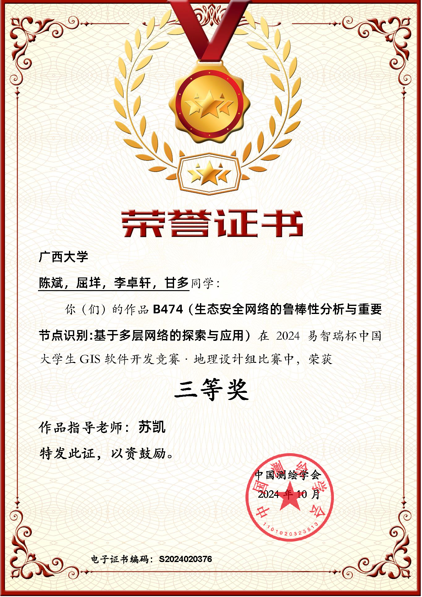 近日,2024年“易智瑞杯”中国大学生GIS软件开发竞赛地理设计组评选结果正式揭晓!由我院苏凯老师指导的作品《生态安全网络的鲁棒性分析与重要节点识别:基于多层网络的探索与应用》(参赛学生:陈斌、屈垟、甘多、李卓轩)和《基于深度学习与生态网络的南宁城区水源涵养能力提升与蓝绿基础设施优化》(参赛学生:陈兴华),获地理设计组三等奖。