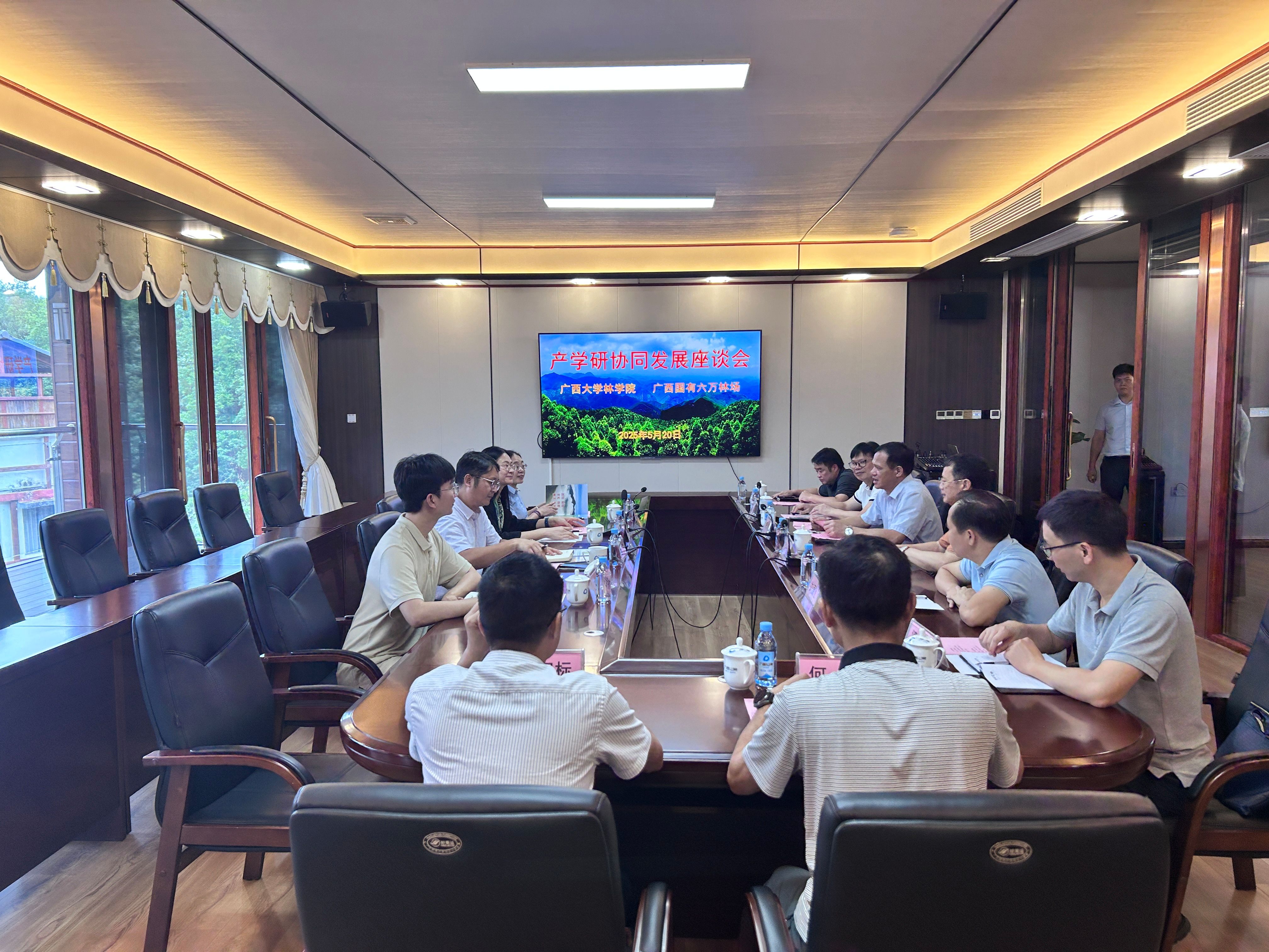 在六万林场,黄里云一行与林场党委书记、场长邓永胜等负责人一同先后实地考察了科研项目《黑木相思人工林产业关键技术开发》试验林、六万林场林下种植金毛狗示范基地,详细了解项目的进展、森林资源管护、林下经济及森林康养发展等情况。随后,双方召开座谈会,围绕“如何进一步深化产学研合作模式、健全校企合作机制、促进林业科技成果落地生根”开展了科产教深度融合的探讨,就如何搭建更高效的校企对接平台、实现科学育人育才、推动林业科研成果转化应用等内容交换了建议和意见。黄里云表示,校企合作是加强学科交叉融合建设的有效举措,期待双方在“科研协同攻关”“人才联合培养”“智慧林业发展”等方面深入交流合作,推动科研成果与林场产业需求精准对接,构建产学研用融合新生态。