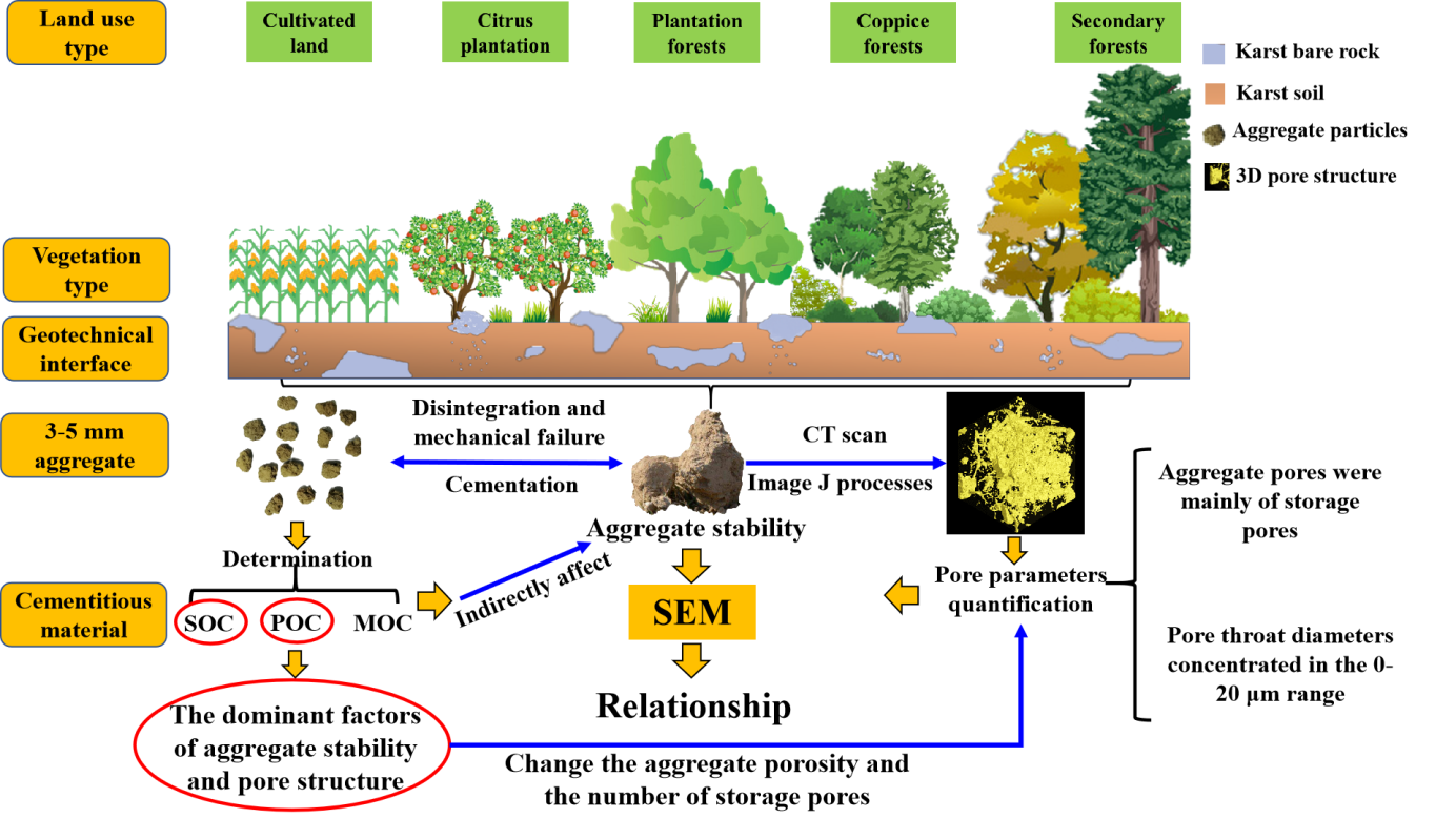 对此,我院研究团队提出科学假设:喀斯特地区不同土地利用类型下土壤胶结物质含量可能通过影响其孔隙内部结构,进一步造成团聚体稳定性差异。为验证这一假设,研究团队通过CT扫描耕地、果园、人工林、灌木林以及次生林5种最典型土地利用类型的土壤团聚体内部孔隙结构,开展不同土地利用类型中土壤主要胶结物质包括有机碳、团聚体孔隙结构以及团聚体稳定性特征分析,并结合结构方程模型(SEM)对各变量间的耦合关系进行定量分析(图1)。
