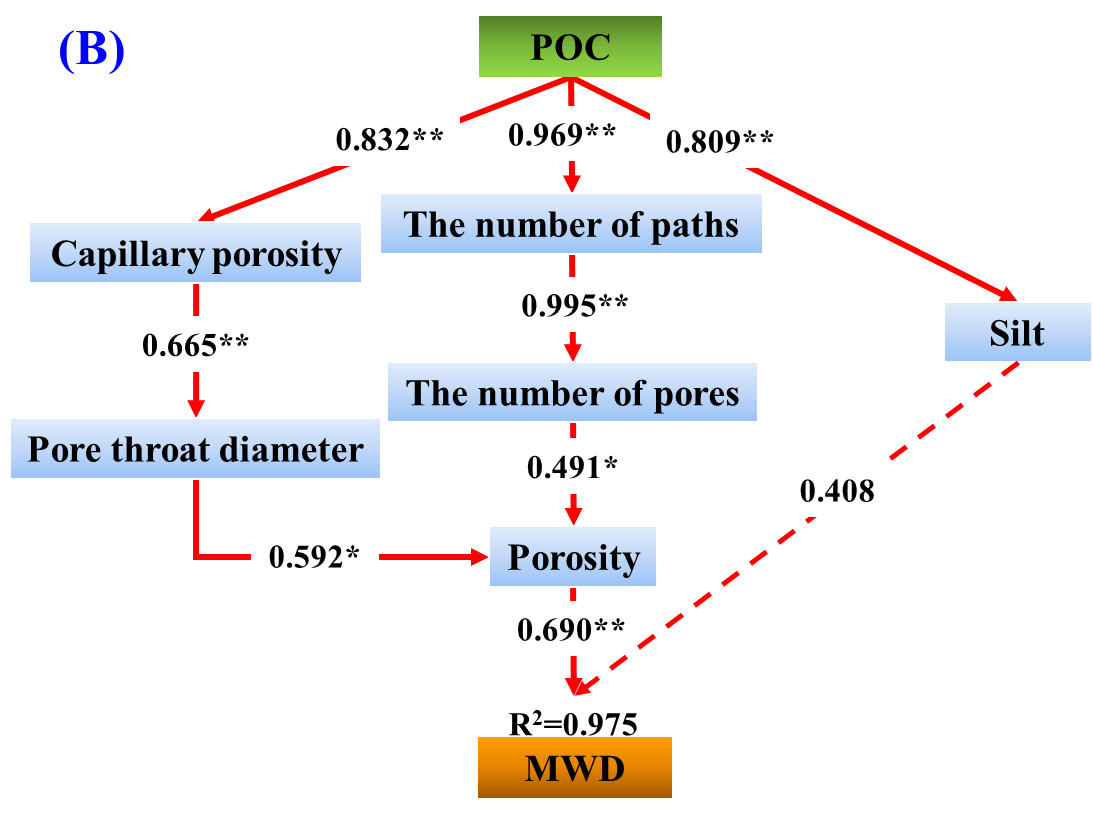 研究发现,喀斯特峰丛洼地不同土地利用间土壤团聚体稳定性差异显著,主要与人为扰动频率以及土壤胶结物质有关。土壤团聚体的主要破坏机制则源于大雨或暴雨产生的消散作用以及耕作产生的机械破坏作用。CT扫描显示(图2),团聚体孔隙分布均以<30 μm的贮存孔隙为主,孔喉直径都集中分布于0-20 μm。各团聚体孔隙连通性以次生林和灌木林最佳,而受高频人为扰动的果园和耕地团聚体则以不均匀孔隙分布为主,连通性差。相关性分析显示,碳组分中POC(颗粒有机碳)是影响土壤孔隙特征和团聚体结构稳定的主导因素。结构方程模型SEM(图3)模型表明,土壤质地在一定程度上对团聚体稳定性造成影响,胶结物质SOC和POC则可通过直接或间接影响土壤孔隙度和贮存孔隙数量来改变团聚体稳定性。