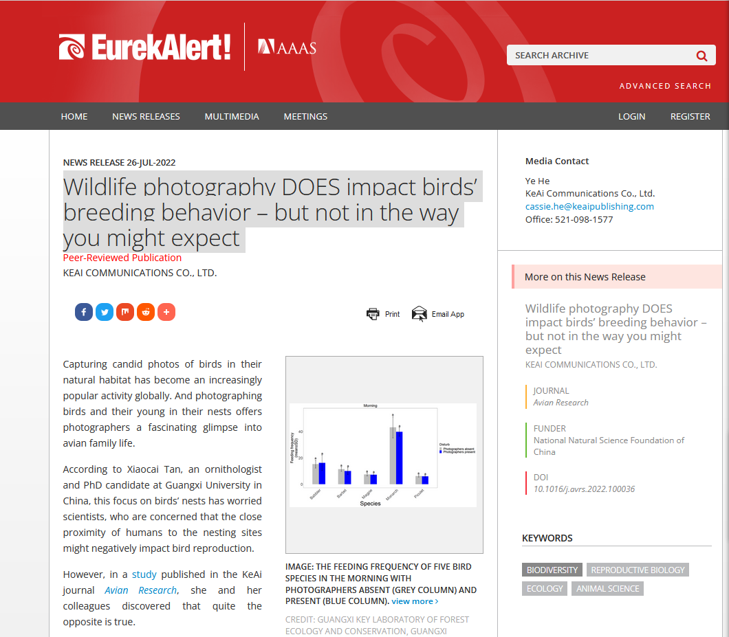 近期,《Avian Research》发表我院喀斯特森林鸟类科研成果“Does bird photography affect nest predation and feeding frequency?”,我院生态学博士生谭筱彩为第一作者,蒋爱伍副教授为该研究论文的通讯作者。文章上线后,美国科学促进会(AAAS)主办的全球科学新闻发布平台“EurekAlert!”以“Wildlife photography DOES impact birds breeding behavior – but not in the way you might expect”为题对该成果进行了报道,认为该研究加深对野生动物摄影及潜在效应的认识,对喀斯特森林生物多样性保护具有重要的意义。
