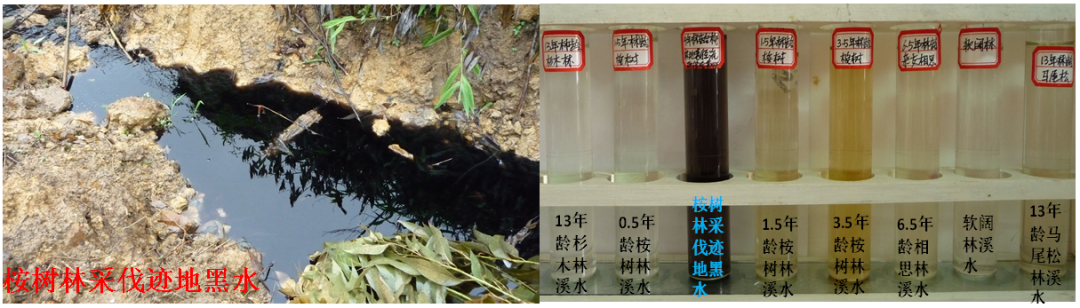 二、桉树人工林流出的水是否“有毒”(1)“黑水”的形成机理颜色变黄、偶尔还会出现黑色,这是改种为桉树后林区河流水体颜色变化现象,这些“黄水”、“黑水”是否有毒?针对上述问题,团队开展了持续且不断深入的研究。通过对野外“黄水”、“黑水”样水质测定和室内“黄水”“黑水”形成模拟试验,发现“黄水”主要源自桉树林冠层和凋落物层的淋溶,高温天气下新鲜采伐剩余物降解淋溶水为“清水”。当“黄水”、“清水”遇上“老铁”(土壤溶液中溶解态二价和三价铁离子)就会生成“铁哥们”组合—黑色的单宁酸铁(墨水的主要成分),这是桉树人工林“黑水”形成的主要机理(Yang et al,2019)。当单宁浓度为50-80 mg/L、铁离子浓度为40-60 mg/L时颜色最深最黑(Yang et al,2019),但大多数情况下,林区径流中没有那么高浓度的游离态铁离子(一般在0.5 mg/L以下),所以“黑水”并非常客。此外,桉树单宁与“老铁”的“铁哥们”关系其实经不起考验,爆发性黑水现象(一般发生在新采伐迹地)一般在3天内就会消失(Yang et al,2019)。