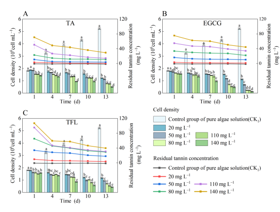 图4 暴露于不同浓度单宁酸(TA)和表没食子儿茶素没食子酸酯(EGCG)以及桉树单宁(TFL)下铜绿微囊藻的藻密度以及培养液单宁浓度随时间的变化(Xie et al, 2023)