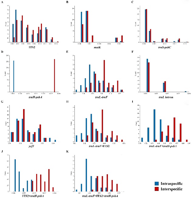 研究结果显示,在基于遗传距离的分析中,trnH-psbA与ITS2+trnH-psbA的种间距离大于种内距离,且二者的频率分布图均不存在重叠区域。基于BLAST的分析结果表明,通过trnH-psbA能够在种的水平上准确鉴别这两个树种。基于序列特征的方法中,单条序列中的trnL-trnF、trnH-psbA与所有的组合序列均能用于降香黄檀与东京黄檀的鉴别。此外,基于trnH-psbA与ITS2+trnH-psbA构建的NJ树能将降香黄檀与东京黄檀聚集在两个不同的支系上。上述结果表明,在所有的评估方法中利用BLOG算法进行的基于序列特征的分析方法具有最佳的鉴别效果,且组合序列能够在一定程度上提高对树种的鉴别效率。最后,该研究提出将序列trnH-psbA、ITS2+trnH-psbA作为鉴别降香黄檀与东京黄檀的DNA条形码。