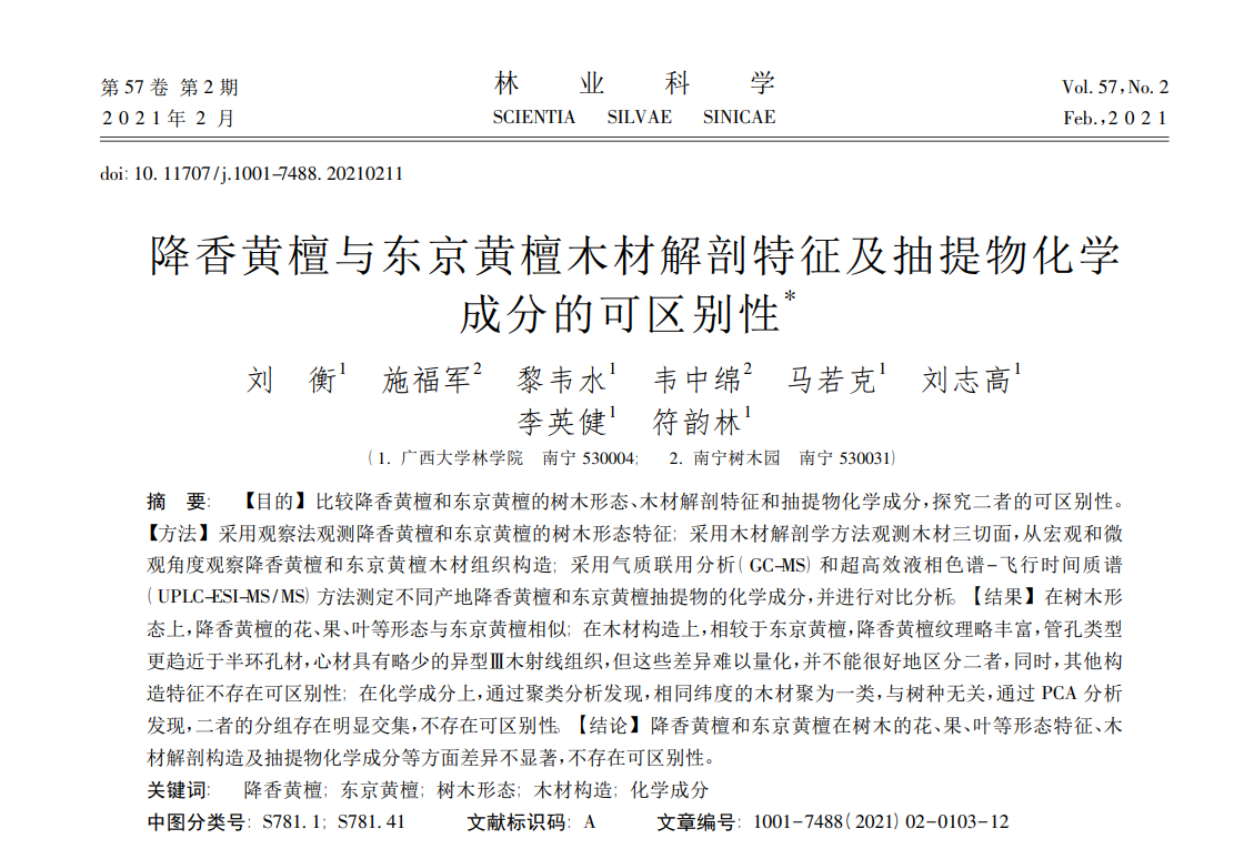 该研究是在传统的方法之上对降香黄檀和东京黄檀的鉴定进行了更加深入的探索。而在此之前,符韵林教授团队也对降香黄檀和东京黄檀的树木形态、木材解剖特征和抽提物化学成分等方面进行了比较,对二者之间的可区别性进行探究。研究结果表明,在树木形态上,降香黄檀的花、果、叶等形态与东京黄檀相似;在木材构造上,相较于东京黄檀,降香黄檀纹理略丰富,管孔类型更趋近于半环孔材,心材具有略少的异型Ⅲ木射线组织,但这些差异难以量化,并不能很好地区分二者,同时,其他构造特征不存在可区别性;在化学成分上,通过聚类分析发现,相同纬度的木材聚为一类,与树种无关,通过PCA分析发现,二者的分组存在明显交集,不存在可区别性。因此,该研究认为通过上述指标无法实现降香黄檀与东京黄檀的鉴别。此项研究成果《降香黄檀与东京黄檀木材解剖特征及抽提物化学成分的可区别性》发表在《林业科学》期刊上。