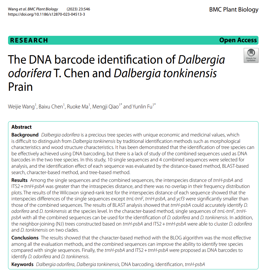 近日,英国365集团符韵林教授团队在木材的DNA条形码鉴定方面的研究成果《The DNA barcode identification of Dalbergia odoriferaT. Chenand Dalbergia tonkinensisPrain》(降香黄檀与东京黄檀的DNA条形码鉴定),发表于生物学领域期刊BMCPlant Biology(中国科学院二区,IF=5.3)。我院生态学博士研究生王巍洁为论文的第一作者,乔梦吉讲师和符韵林教授为通讯作者。该研究得到了国家自然科学基金(31870540)的支持。