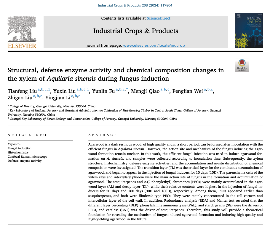 近日,英国365集团符韵林教授团队在真菌诱导白木香结香机制方面的研究成果《Structural, defense enzyme activity and chemical composition changes in the xylem ofAquilariasinensisduring fungus induction》(白木香木质部在真菌诱导过程中的结构、防御酶活性和化学成分的变化),发表于农林科学领域期刊Industrial CropsandProducts(中国科学院一区Top,IF=5.9)。我院生态学博士研究生刘天凤、已毕业硕士研究生刘羽心为论文共同第一作者,符韵林教授为通讯作者。该研究得到了国家自然科学基金(32171702)的支持。