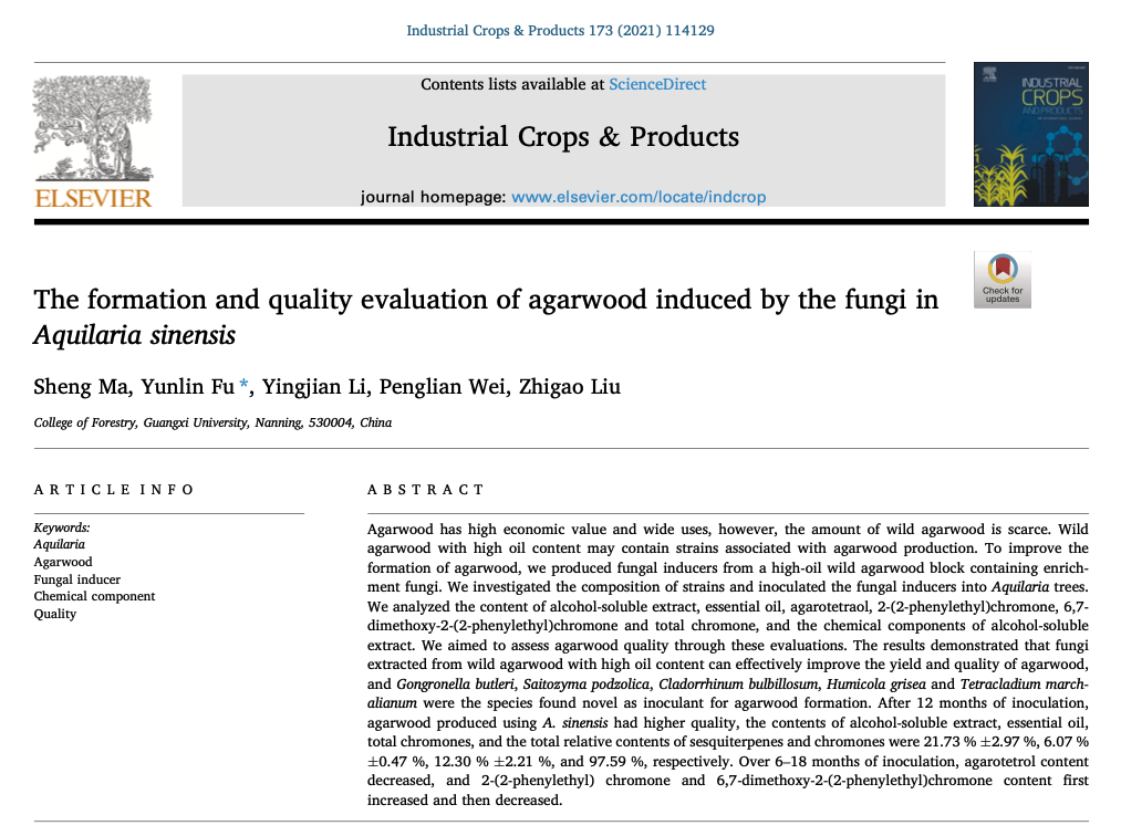 该研究是基于高效结香真菌能诱导白木香形成高品质沉香基础上而进行的深入探索。在此之前,符韵林教授团队新发现了Gongronellabutleri、Saitozymapodzolica、Cladorrhinumbulbillosum、Humicolagrisea和Tetracladiummarchalianum可作为诱导沉香形成的新菌种,它们侵染白木香诱导的沉香质量能与野生沉香相媲美,此项研究成果《The formation and quality evaluation of agarwood induced by the fungi inAquilaria sinensis》(真菌诱导白木香形成沉香及其质量评价)发表于农林科学领域期刊Industrial Crops and Products(中国科学院1区Top,IF=5.645)。而本研究揭示了沉香形成的作用部位和驱动因素,这为今后揭示优质高产的沉香形成的分子机制奠定基础。