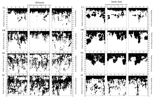 图2 土壤垂直剖面优先流形态分布特征