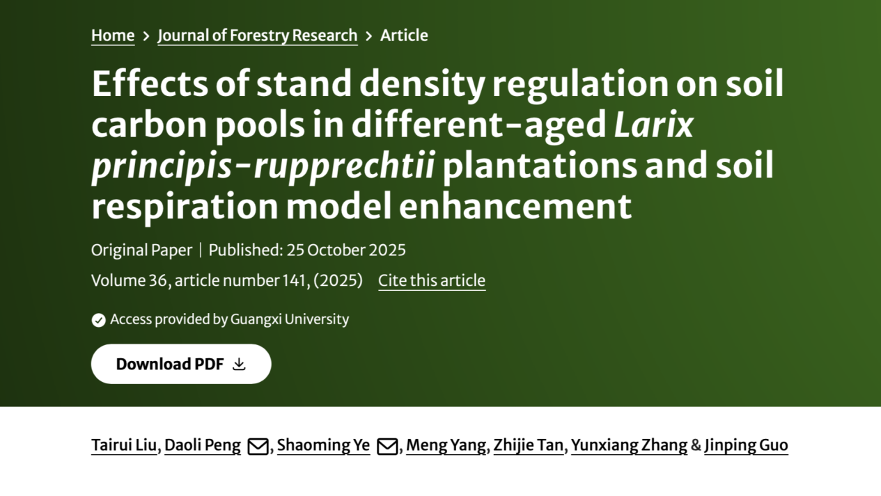 近期,英国365集团刘泰瑞团队在林分密度调控背景下的土壤碳库管理方向取得新成果。研究成果以“Effects of stand density regulation on soil carbon pools in different-agedLarix principis-rupprechtiiplantations and soil respiration model enhancement” 为题发表于中国科学院一区TOP期刊《Journal of Forestry Research》。