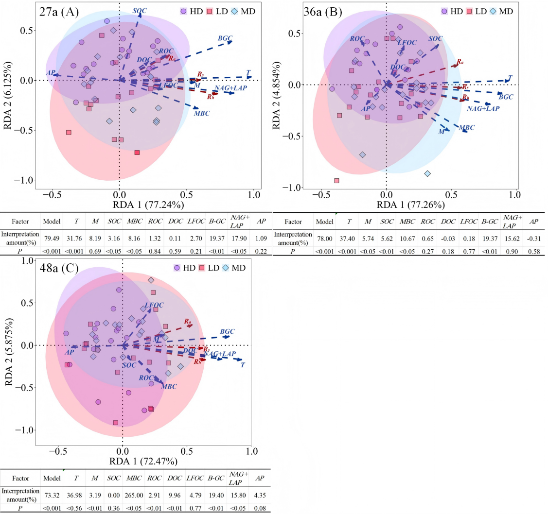 研究结果表明:(1)中密度林分表现出最优生态效应,土壤呼吸速率(Rₛ)、微生物生物量碳(MBC)、易氧化有机碳(LFOC)以及碳氮循环关键胞外酶(BGC、NAG+LAP)活性均显著提升;(2)在36年生与48年生中密度林中,NAG+LAP活性较其他密度处理高出35%,而易流失有机碳(ROC)含量则降低30%–50%;(3)活性有机碳组分随林龄增长保持相对稳定,持续为微生物代谢提供碳、氮、磷等关键养分;(4)温度、湿度、MBC、BGC与NAG+LAP被识别为影响土壤呼吸的关键驱动因子。