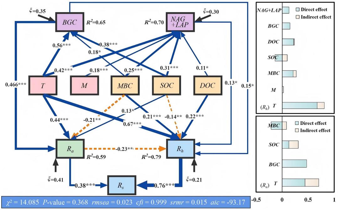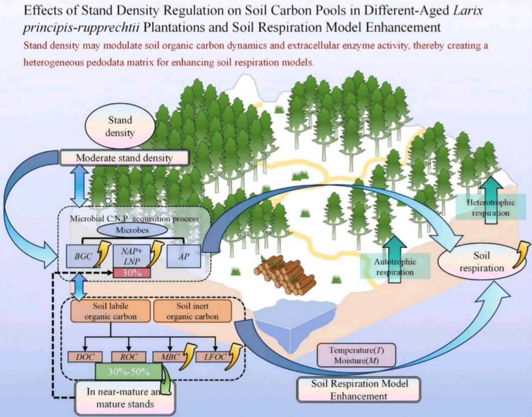 研究核心聚焦林分密度对土壤呼吸的调控机制,其核心路径是“双调节”:一方面通过改变土壤有机碳的储存与转化、调控胞外酶催化活性,直接影响土壤呼吸;另一方面,温度、微生物生物量碳、土壤有机碳及溶解有机碳构成多因子驱动体系——既直接改变根系自养呼吸与微生物异养呼吸速率,又通过调节微生物碳氮获取能力间接影响呼吸强度。此外,研究构建的嵌套林分密度与林龄混合效应模型,经优化后,显著提升了对土壤呼吸与碳库变量共变规律的表征力和数学精度,为量化森林土壤碳循环提供了更可靠的工具。