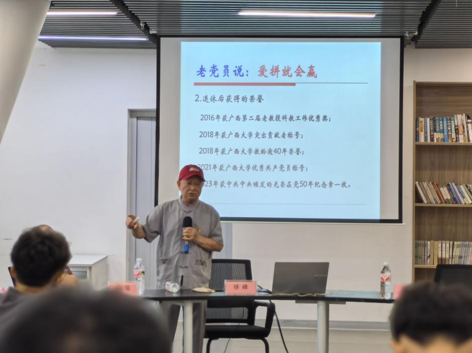 活动伊始,东退十二党支部书记秦武明教授发表讲话。秦教授为大家分享了林业行业的发展历史及广西林业的独特优势。作为森林经济领域的专家,秦教授有着30多年的教学和科研经验。他结合自身经历,告诫同学们要怀有一颗热爱林业的赤子之心,未来工作中牢记使命,林业岗位虽平凡但使命非凡。林业人应具备吃苦耐劳、甘于奉献的精神,以人民幸福为己任,始终坚守党的初心和使命。