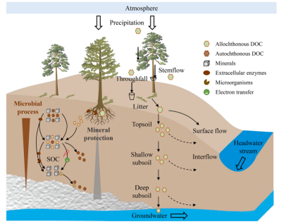 图1.地球关键带视角下河源小流域从降水到溪流和地下水的DOC迁移过程