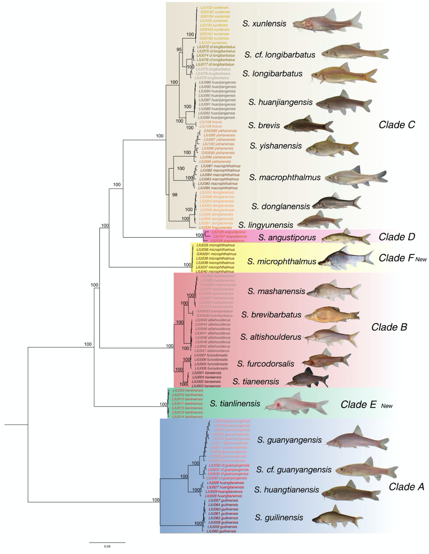 由于生活环境的多样性,导致金线鲃属鱼类形态上发生了显著性差异,是研究穴居生物适应性进化的良好材料。过去在金线鲃属鱼类基因组学的研究中主要使用线粒体DNA片段来研究其遗传和进化,很少使用核DNA片段进行研究。近年来,随着高通量测序技术的发展,研究鱼类基因组学的方法也随之发展,目前在鱼类基因组学研究中,Rad-seq技术在系统发育、种群结构、遗传图谱和适应性进化的研究中得到了广泛应用。马德华团队利用Rad-seq技术对金线鲃属鱼类进行系统发育关系以及适应性进化研究,探究其进化关系、分化时间、物种多样性和基因流动等问题。